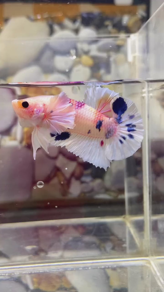 Blue Marble Dot Halfmoon Male Betta Fish: This Halfmoon Betta captivates with its sky-like pattern of blue and white speckles. Each fish is a unique canvas, mirroring the expansive beauty of a star-filled night sky, ensuring that no two specimens are alike—a collector’s dream.