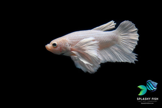 Super White Dumbo Ear Halfmoon Male Betta Fish: With its celestial white color and expansive dumbo ears, this Halfmoon Betta exudes serenity and grace. The silky, flowing fins enhance its heavenly allure, making it an ideal choice for those who seek a peaceful and purifying element in their aquatic environments.