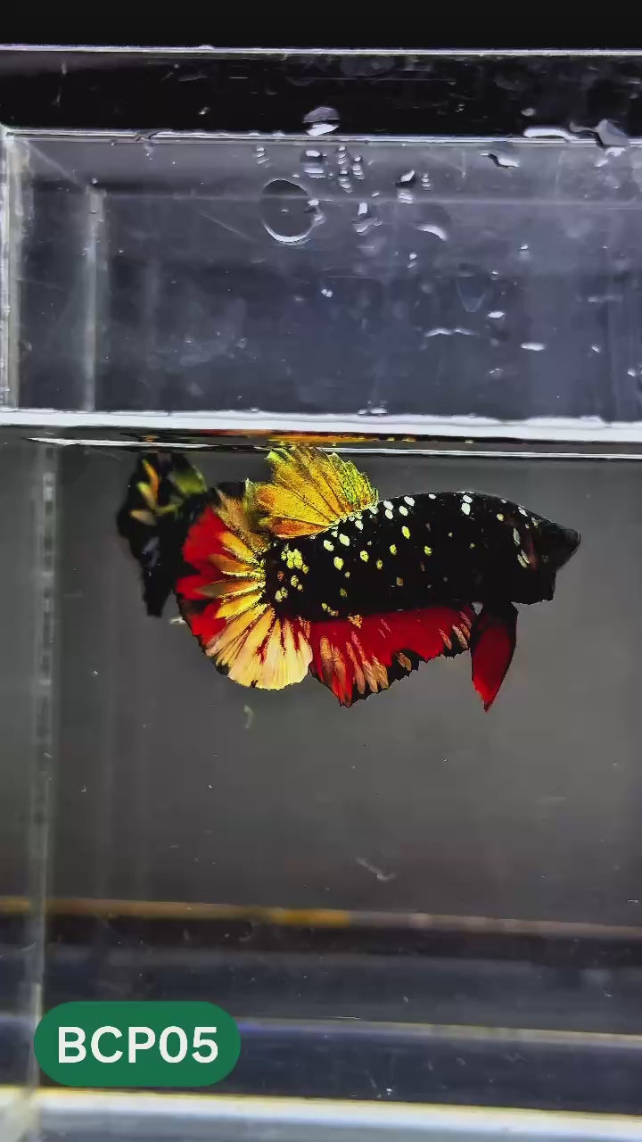 The Black Panther Plakat Male Betta features a deep velvet-black base layered with luxury golden scale highlights that reveal themselves under proper lighting. ✨🖤 This subtle metallic glow gives the fish a mysterious, almost shadow-like presence—never loud, always commanding.