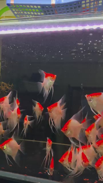 The Koi Albino Red Cap Angelfish is a stunning freshwater species admired for its bright red marking on the head and pale, translucent albino body. This unique combination gives it a clean, elegant appearance with a striking focal point. Peaceful and graceful, it's an ideal choice for aquarists looking to add rare beauty to a planted or community tank.