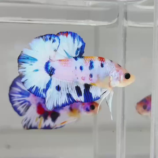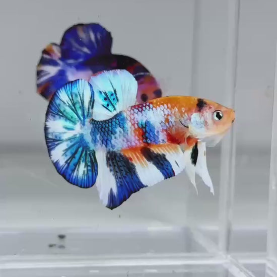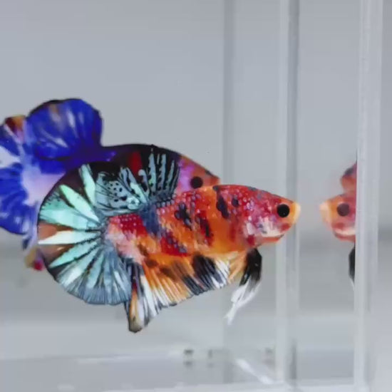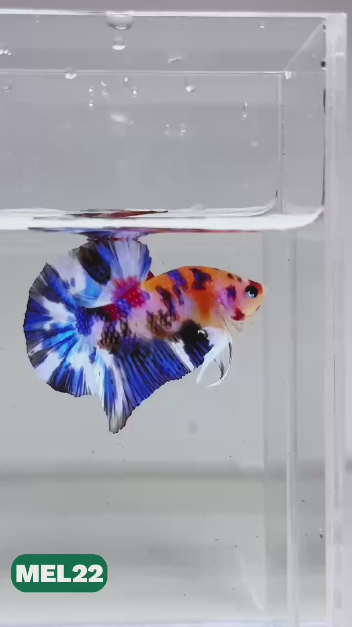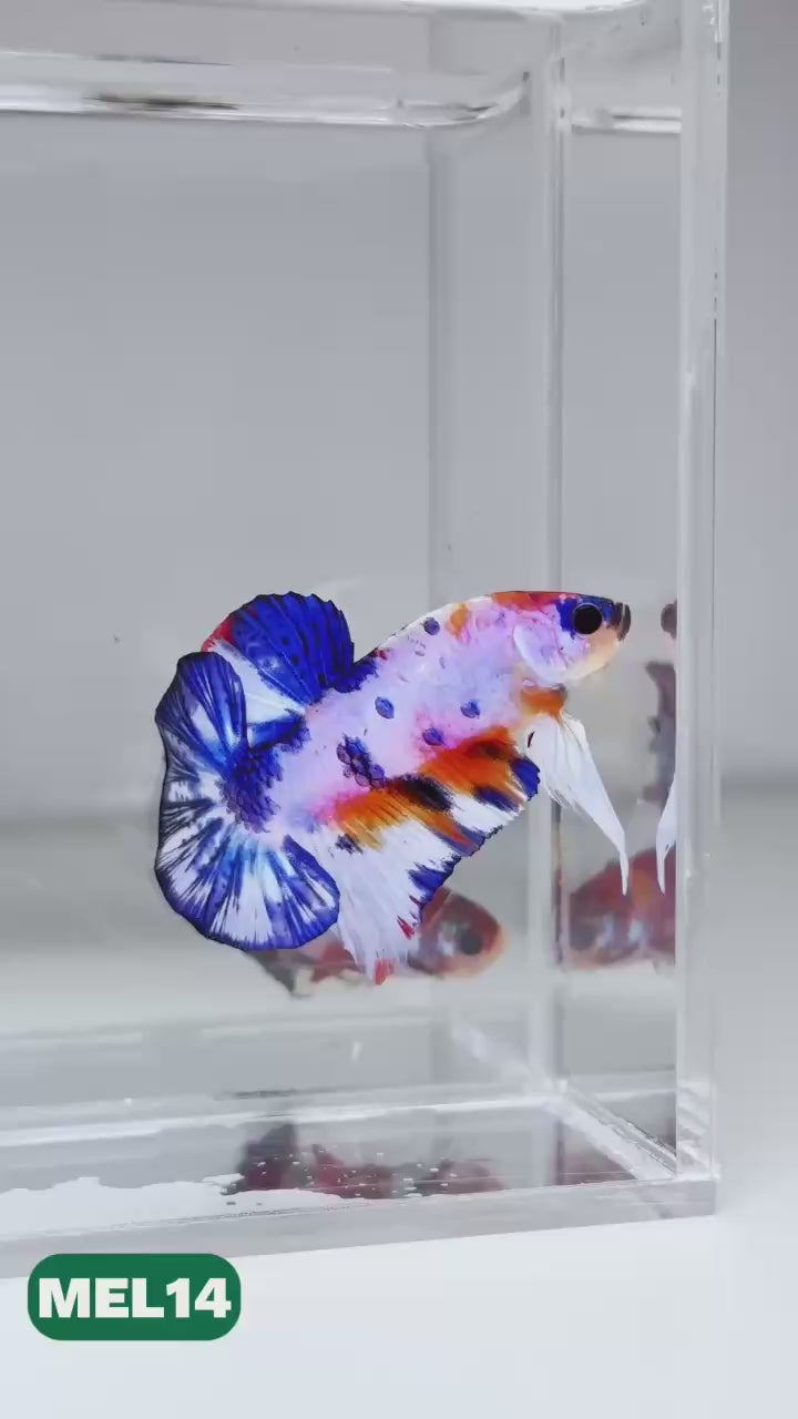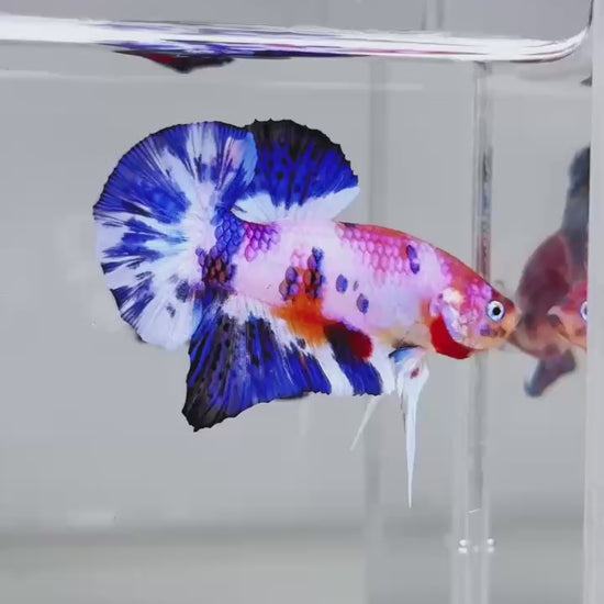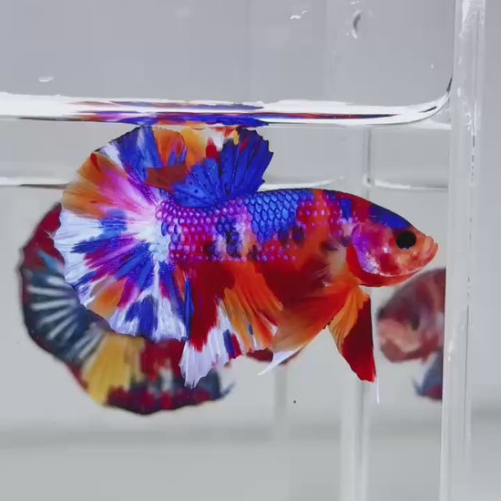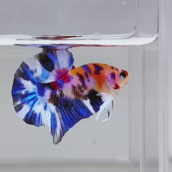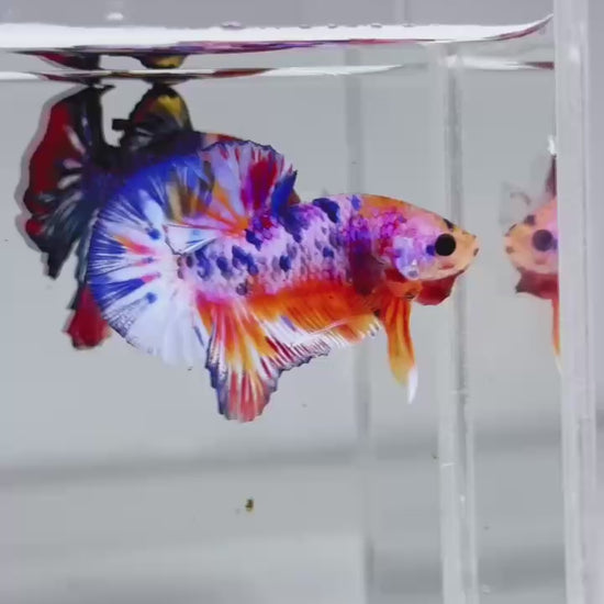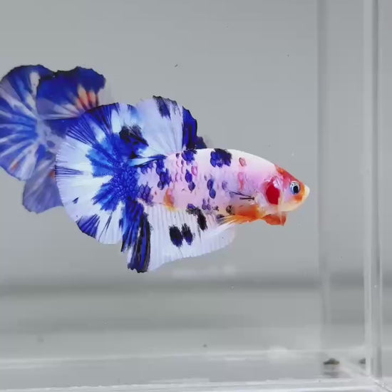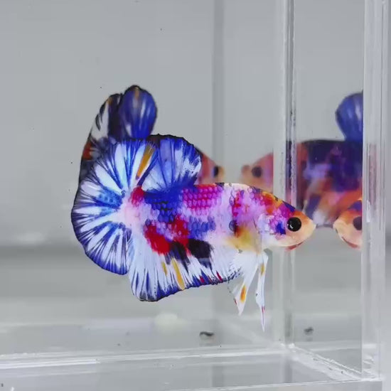 The Metallic Plakat Betta showcases a luminous metallic base that glows under aquarium lighting, accented by koi multicolor marbling that makes every fish completely unique. No two patterns are ever the same.
