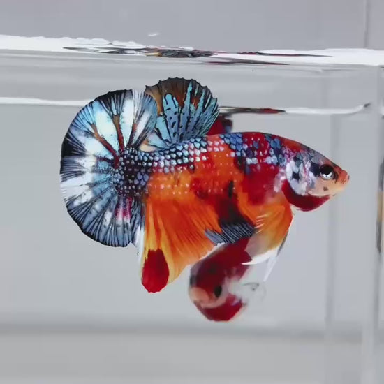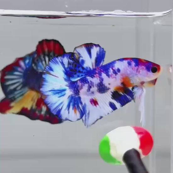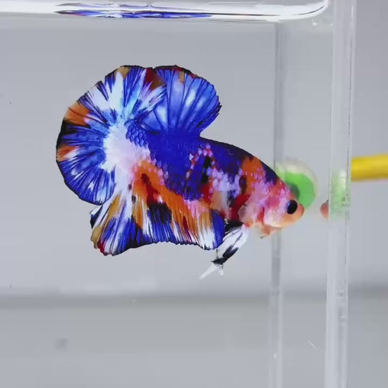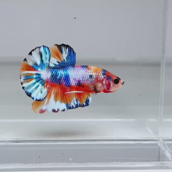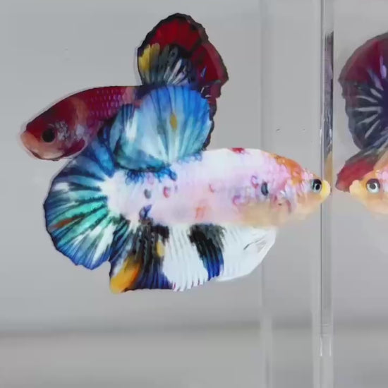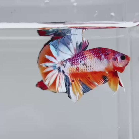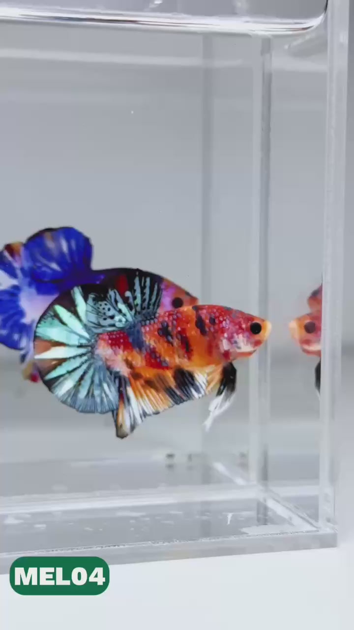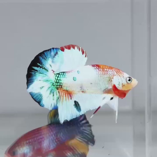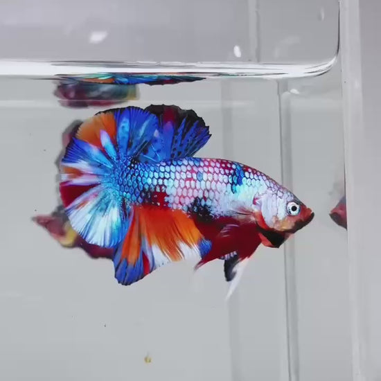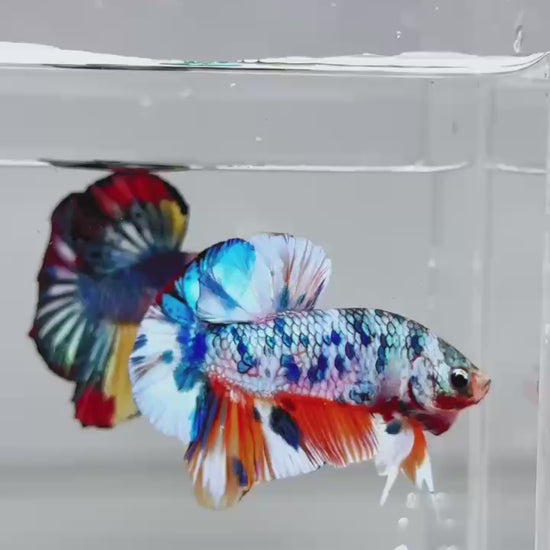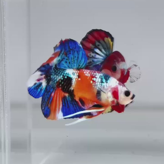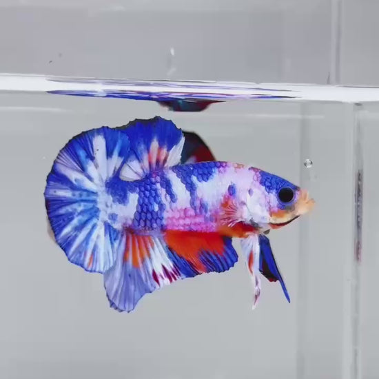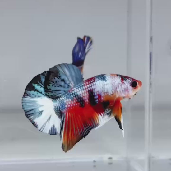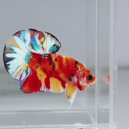 The Metallic Plakat Betta showcases a luminous metallic base that glows under aquarium lighting, accented by koi multicolor marbling that makes every fish completely unique. No two patterns are ever the same.