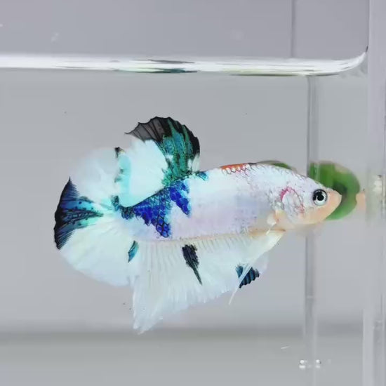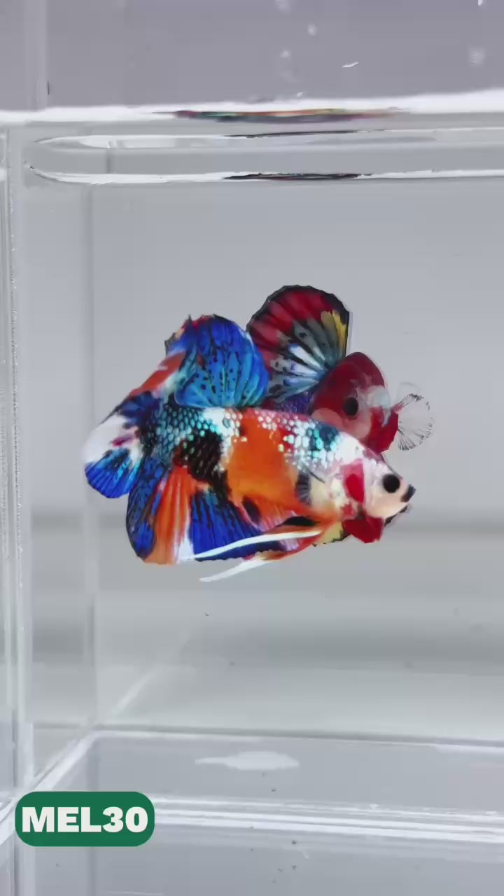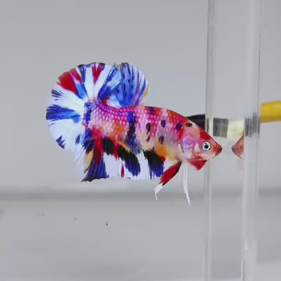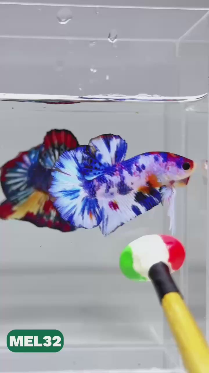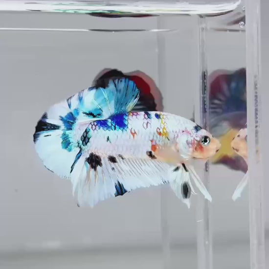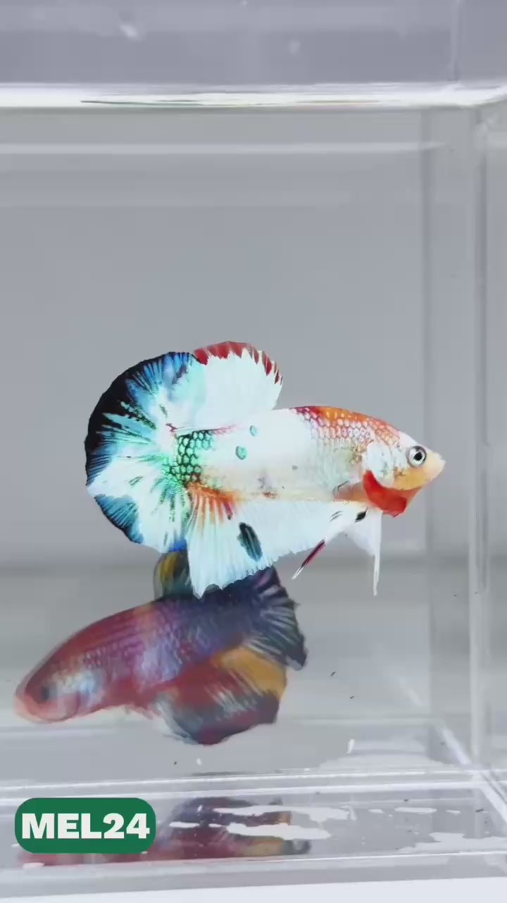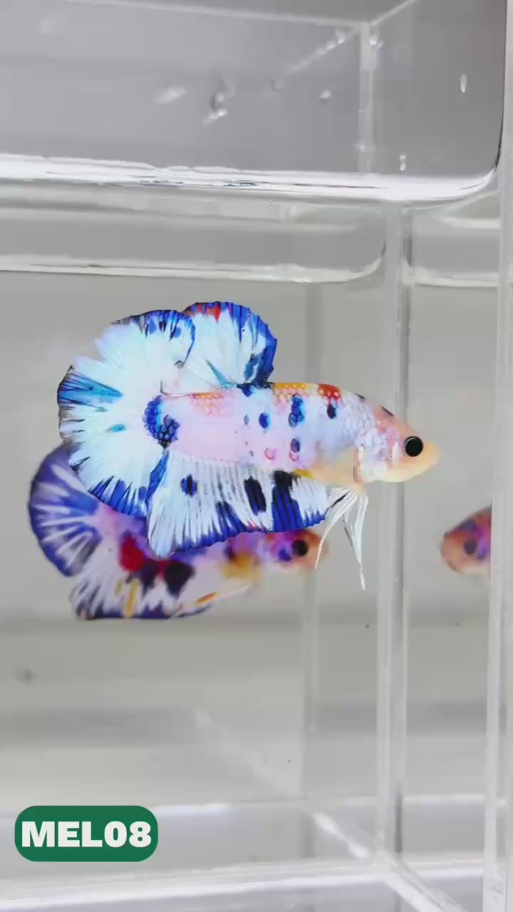 The Metallic Plakat Betta showcases a luminous metallic base that glows under aquarium lighting, accented by koi multicolor marbling that makes every fish completely unique. No two patterns are ever the same.